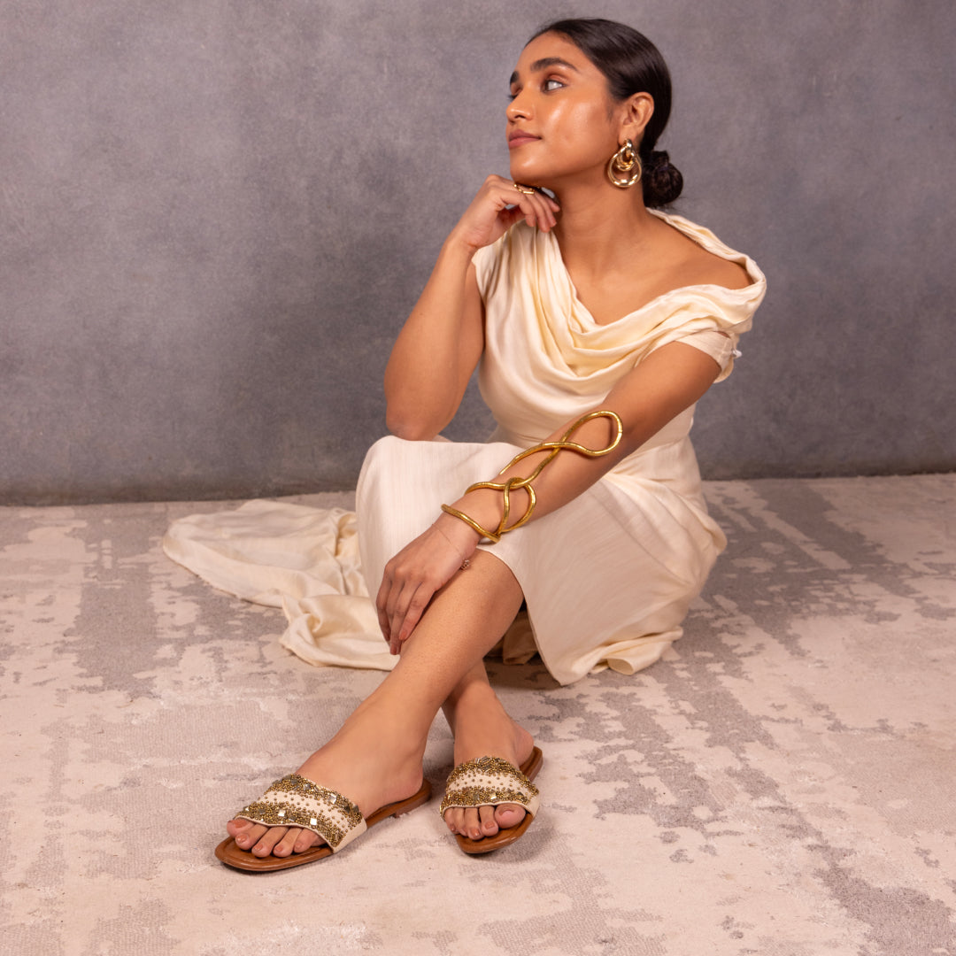 2. Evening Subtle Sparkle: Go for a satin slip dress in earthy tones. Keep hair tucked behind the ears with dewy makeup and delicate layered chains to let the footwear’s shimmer stand out.