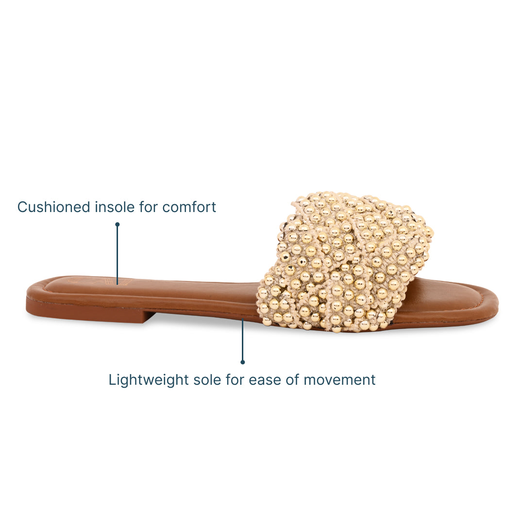 USP: Designed for all-day comfort, this flat showcases intricate fine gold stud work on its elegant strap, finished with a cushioned insole for effortless wear.