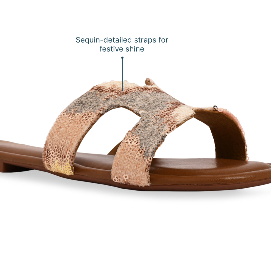 USP: Sequin-detailed straps for festive shine, Classic H-strap silhouette with a polished finish, Cushioned insole for comfort, Lightweight sole for easy movement.