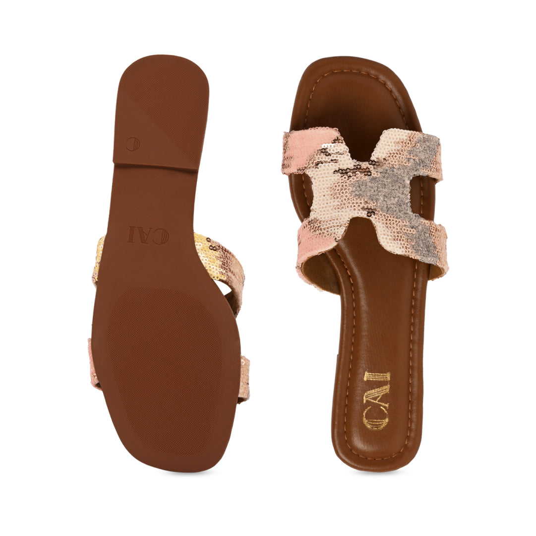 Step into subtle shimmer with our Multi Sequence H Tan Flat. Set on a clean tan base, the straps are detailed with fine multi-coloured sequins that catch the light. The classic H strap silhouette keeps it easy to wear, while the sequins add a festive touch. Lightweight, comfortable, and versatile — perfect for dressing up everyday looks or adding polish to special plans.