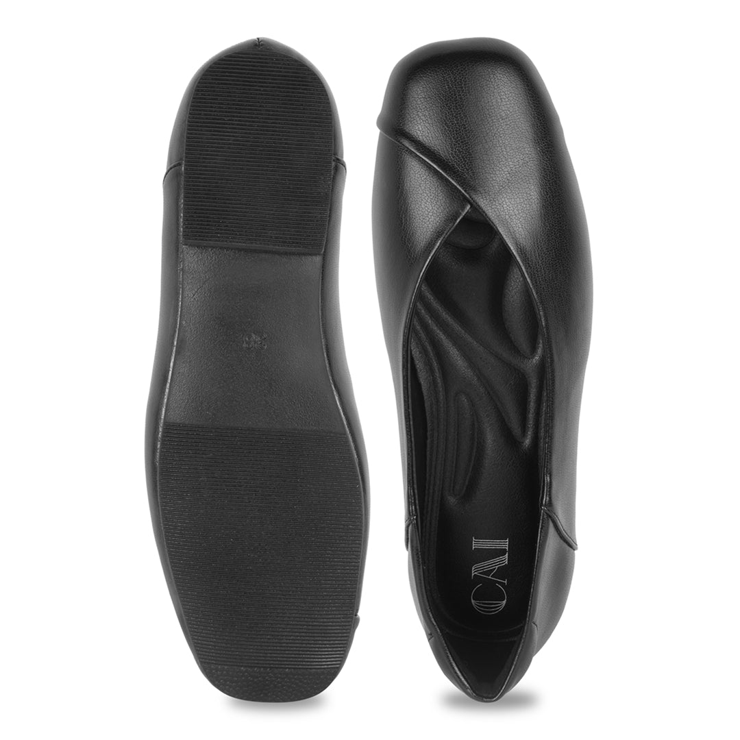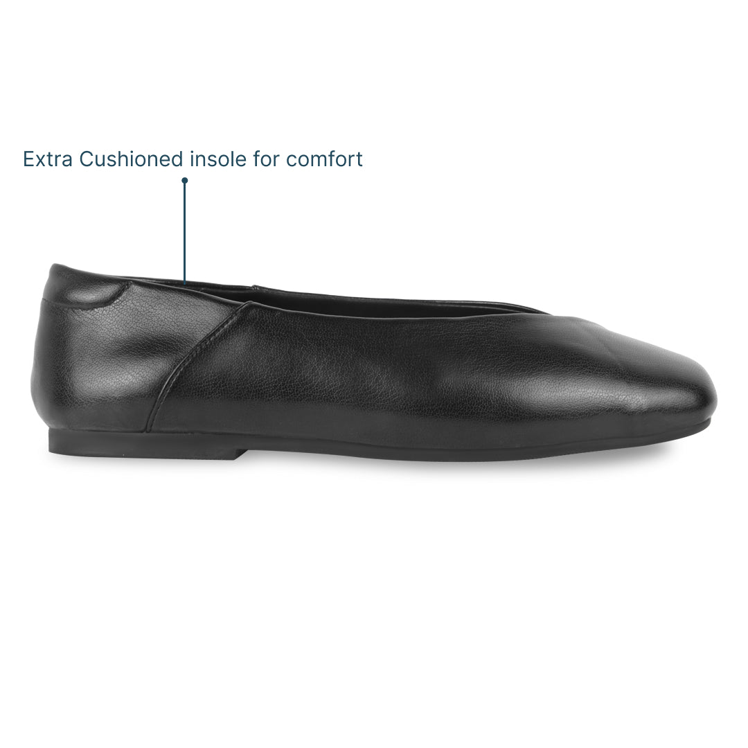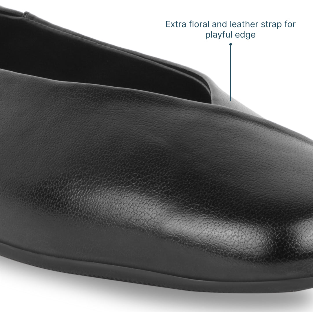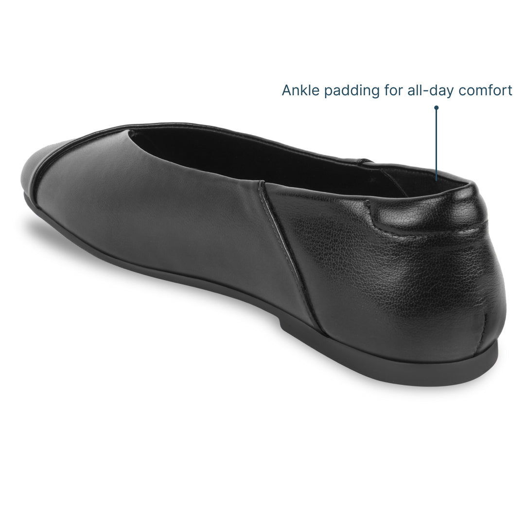 Step into comfort and style with the Elise Black Ballets. Designed with a distinctive cross-over detail on the toe cap, they bring a modern twist to a classic silhouette. The closed-toe design offers a polished look, while the extra-cushioned insole ensures all-day comfort. Lightweight and versatile, these flats are perfect for both casual outings and formal occasions, making them a reliable and stylish choice for any wardrobe.