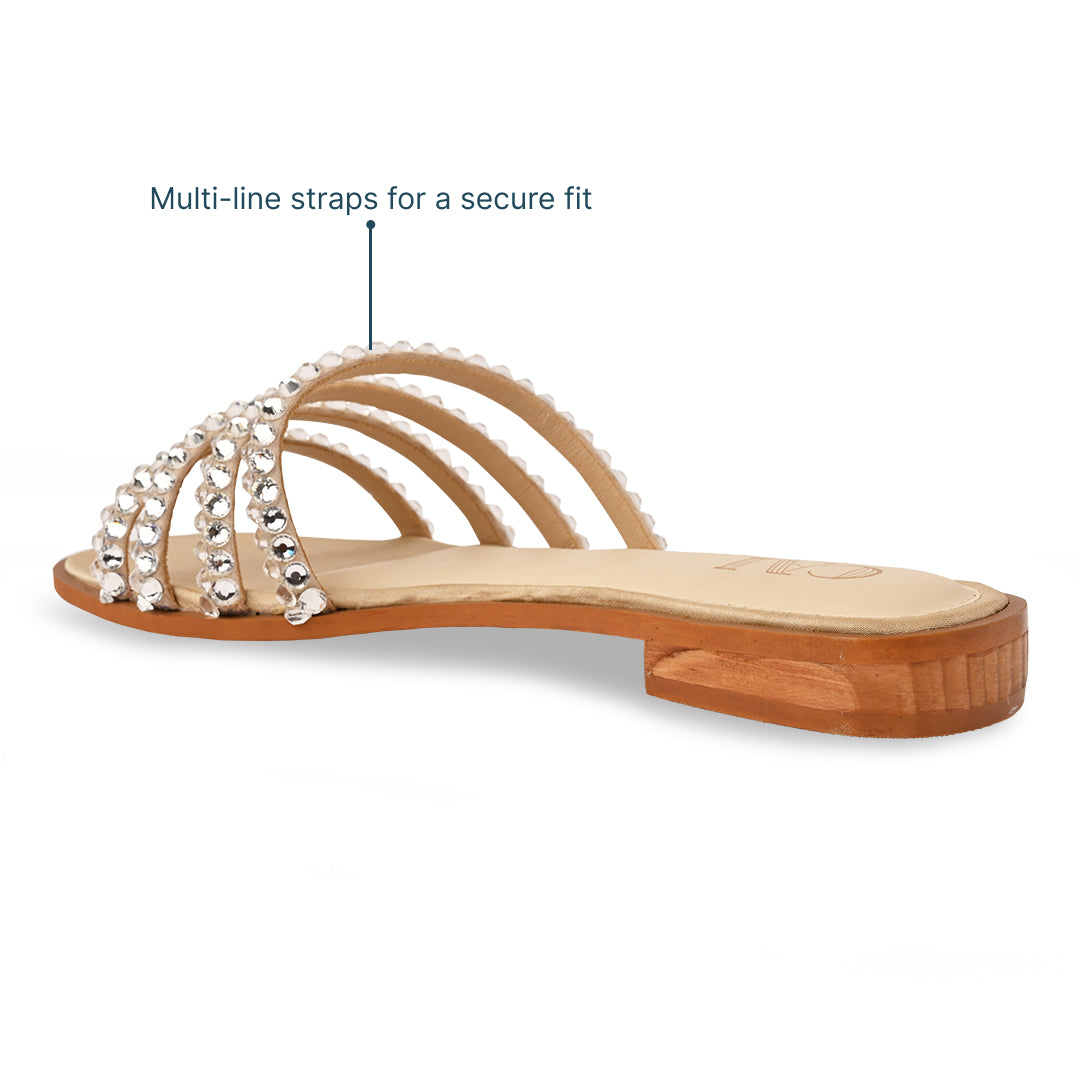 USP: Designed with slim diamond-detailed straps on a luminous gold base, finished with a cushioned insole for all-day comfort.