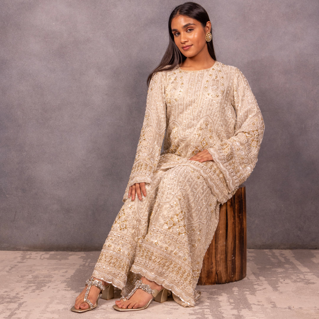 2. Indo-Western Twist: Style with an embellished crop top and a draped skirt—let the floral heels add a feminine finish to your fusion festive look.