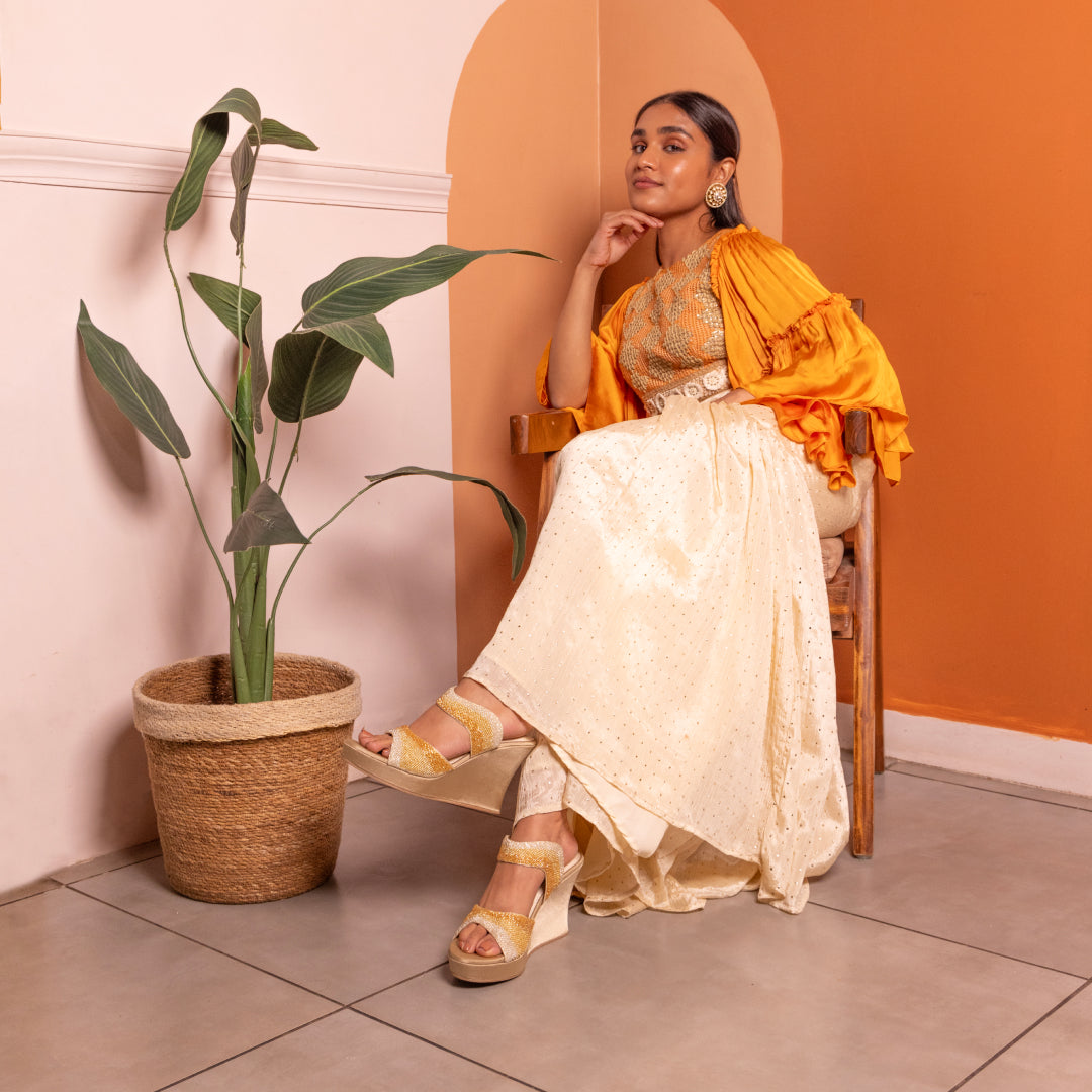 1. Daytime Elegance: Pair with a beige linen jumpsuit for a fresh, elevated day look. Add textured gold earrings and a woven clutch to echo the wedge’s soft shimmer and effortless ease.