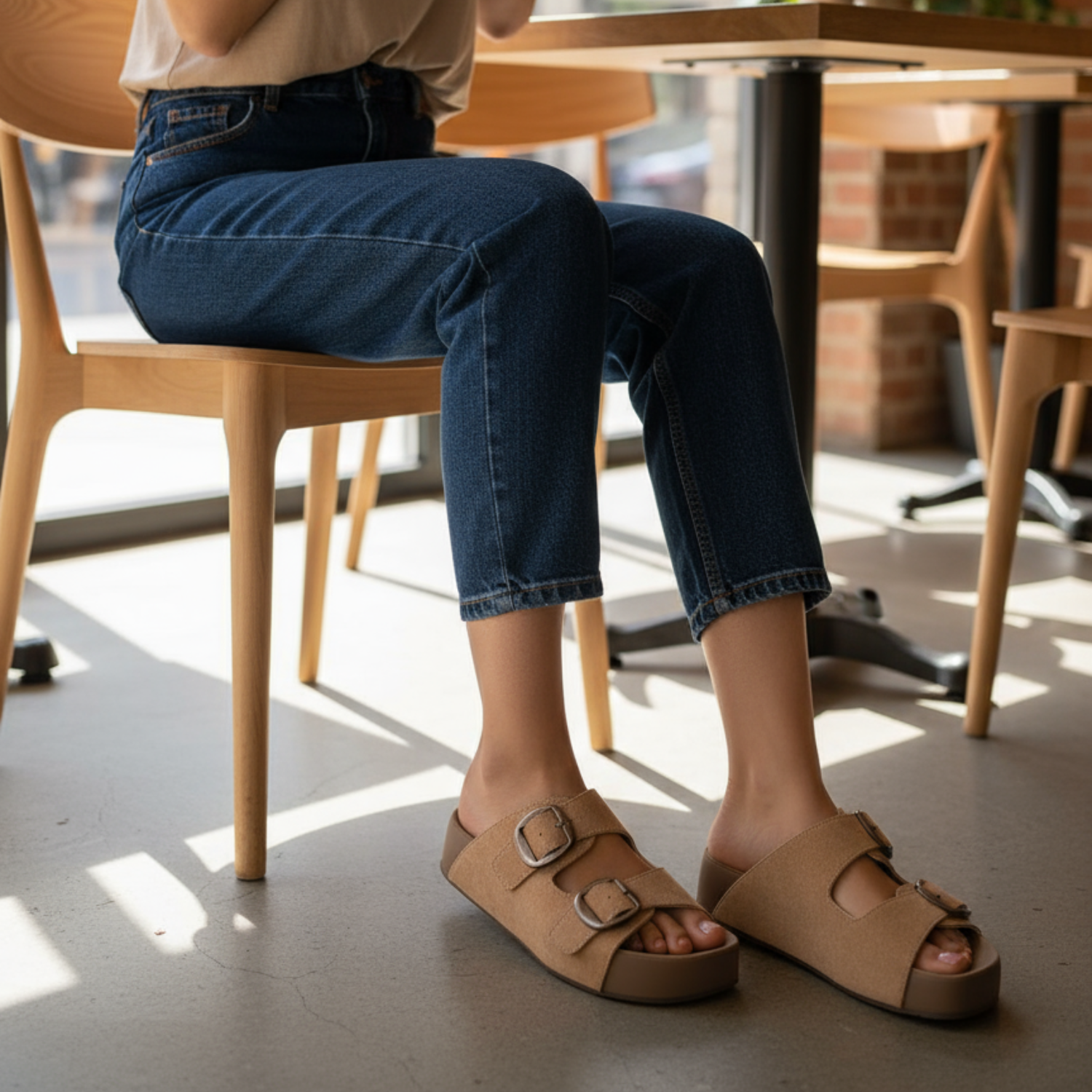 The Strapped beige slider features wide, elegant straps in a timeless beige shade and a cushioned insole for all-day comfort. Its slip-on design and adjustable fit deliver easy wear and lasting style, making it a versatile addition to any wardrobe.