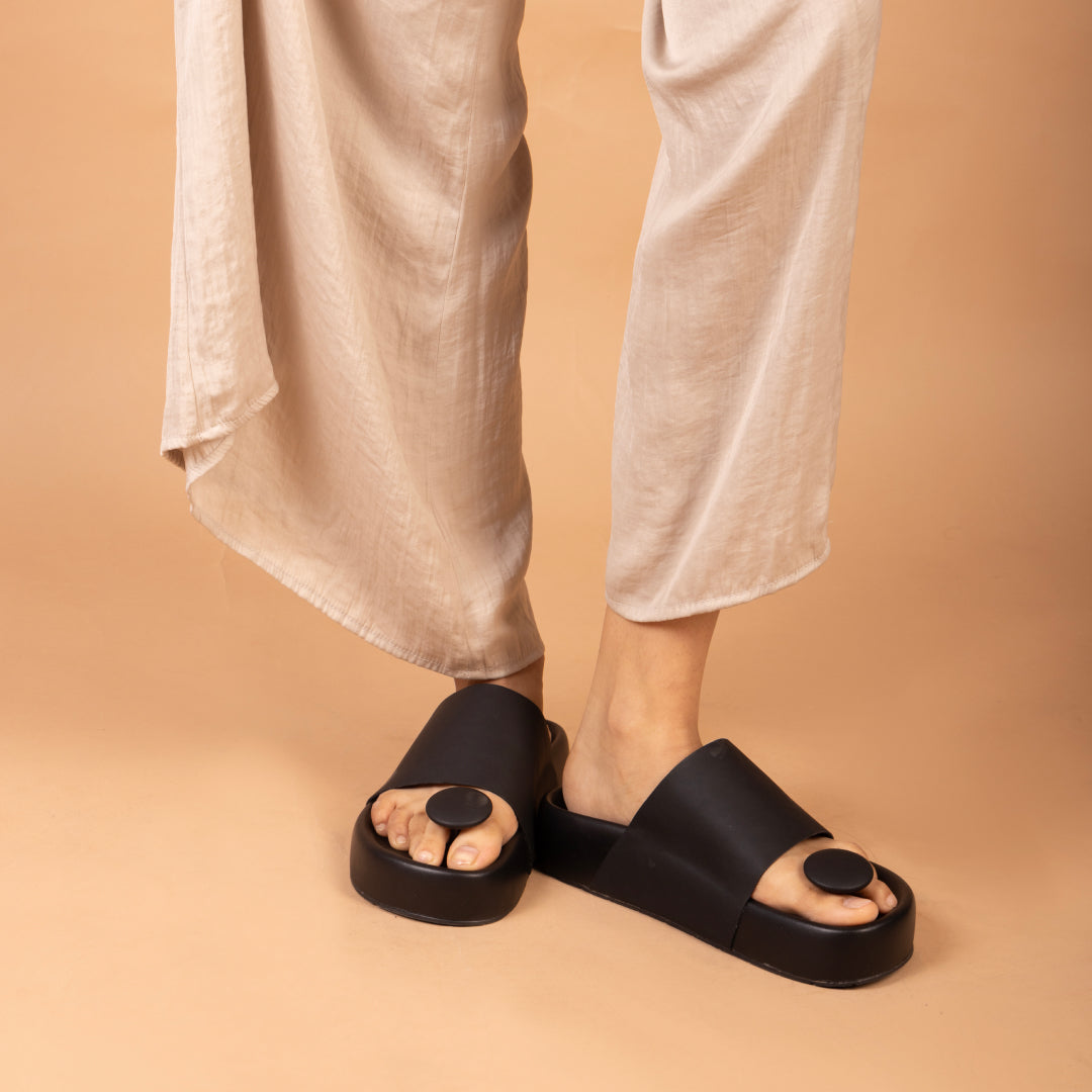 A bold nod to tradition with a modern twist. The Bobble Head Black Thong Platform take cues from the classic paduka silhouette, reimagined with a contemporary platform base. Crafted in sleek black with a distinctive spherical accent at the toe post, this pair blends heritage charm with statement-making edge. The sturdy platform adds height without compromising comfort, making it perfect for pairing with both ethnic fits and fashion-forward outfits.