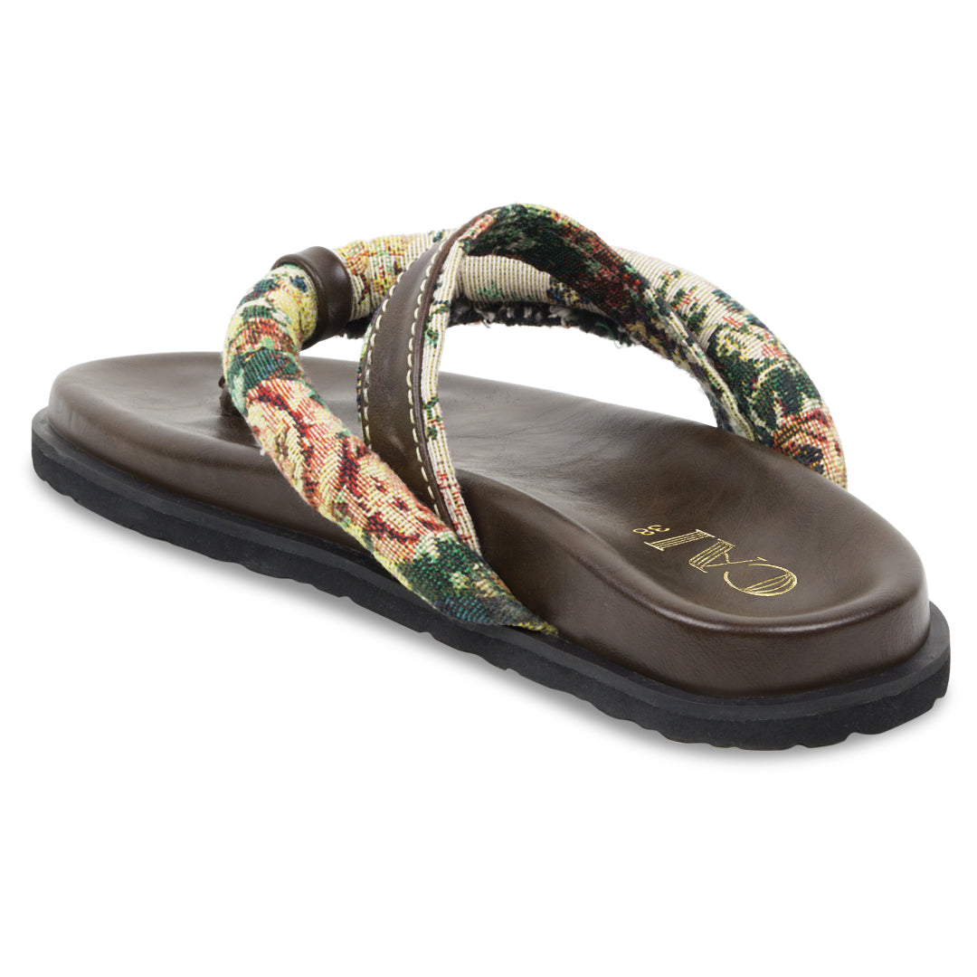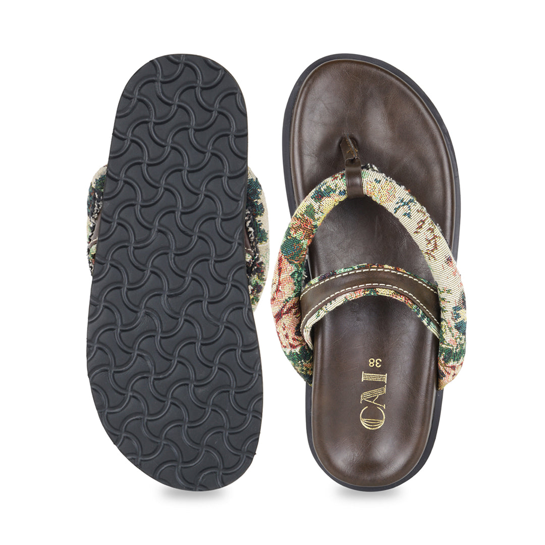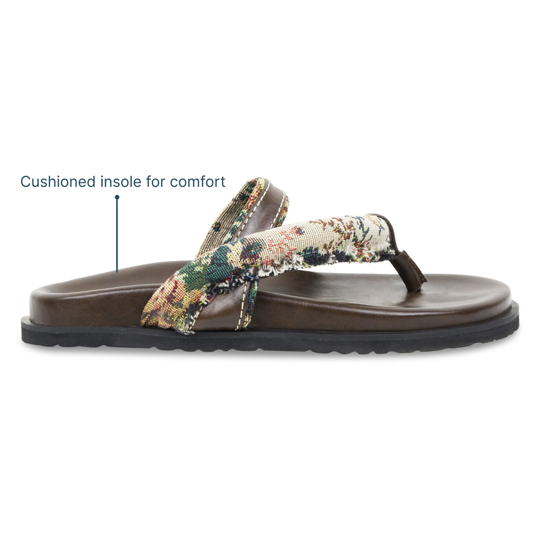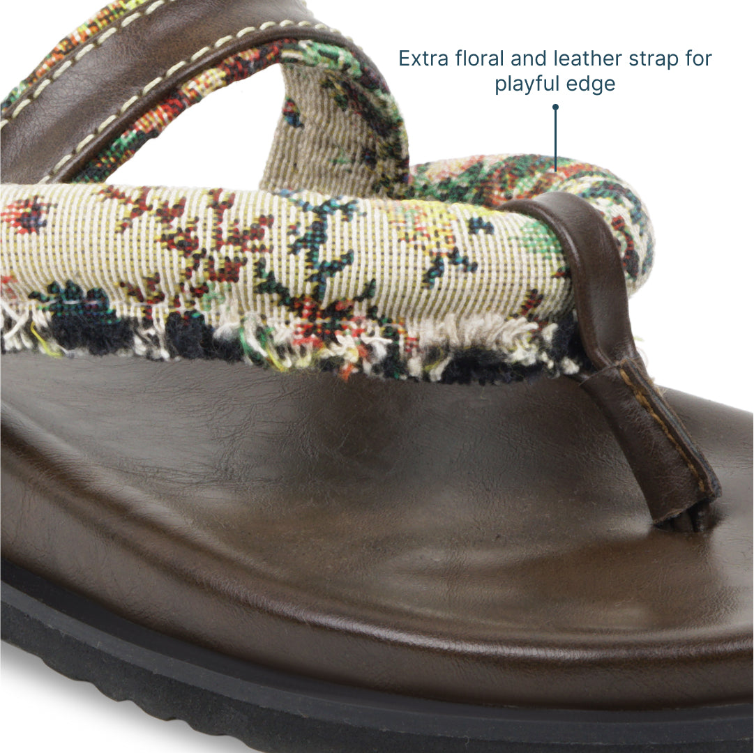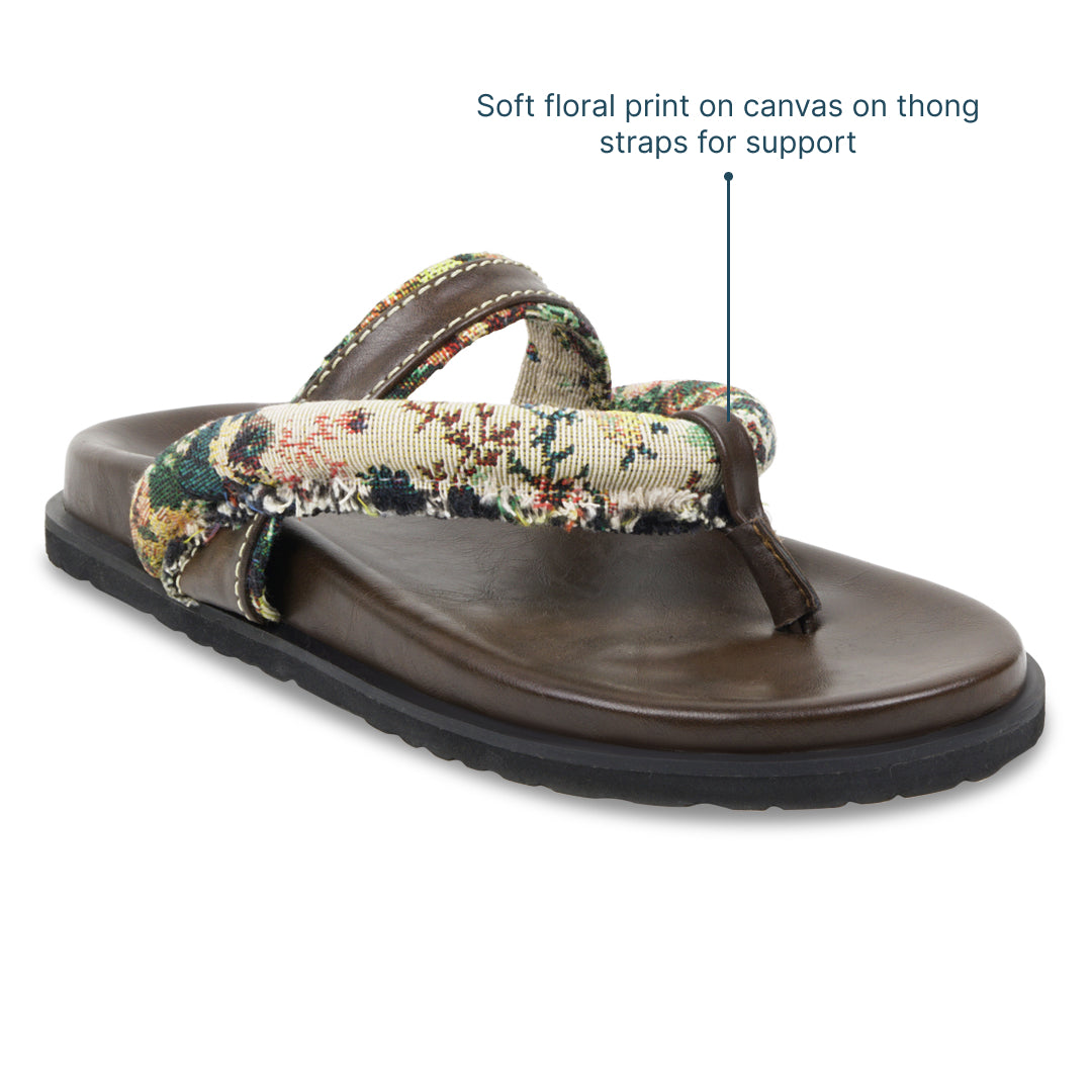 USP- Soft floral print on canvas on thong straps for support, cushioned insoles for all-day comfort and long-lasting wear with extra floral and leather strap for playful edge.