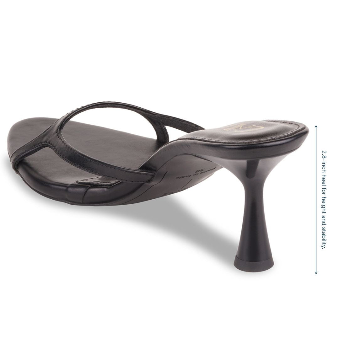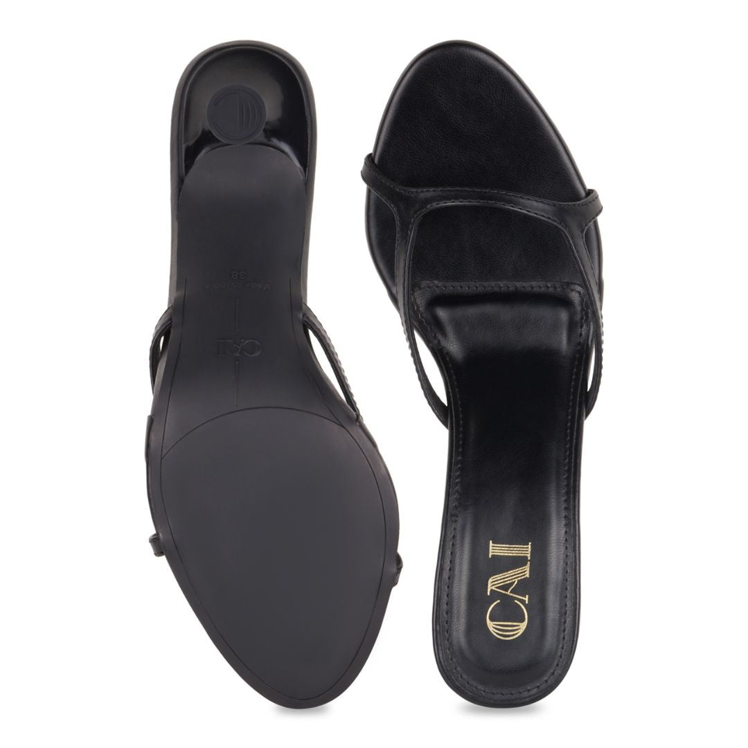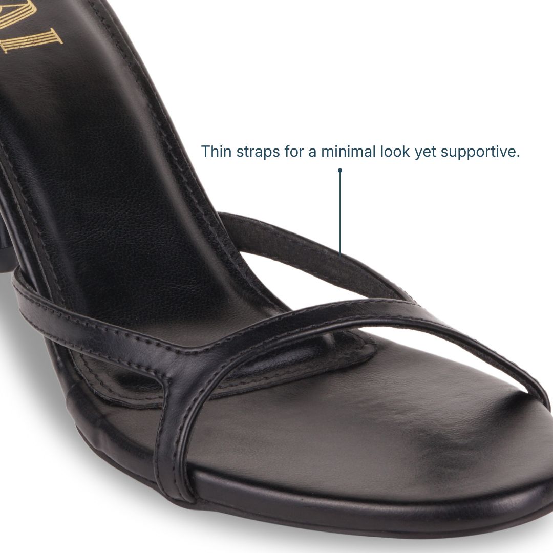 The Bare Black Heels offer a sleek, slip-on silhouette with a slim single strap and distinctive cone heel for modern ease. The clean black finish delivers understated polish and all-day comfort, making them a versatile go-to for everything from jeans to dresses.