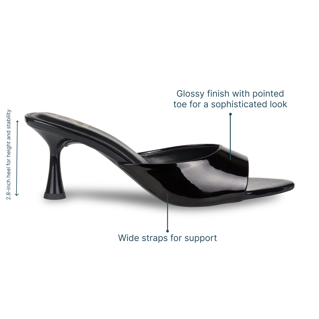 USP: Glossy finish with pointed toe for a sophisticated look, wide straps for support and 2.8-inch heel for height and stability.