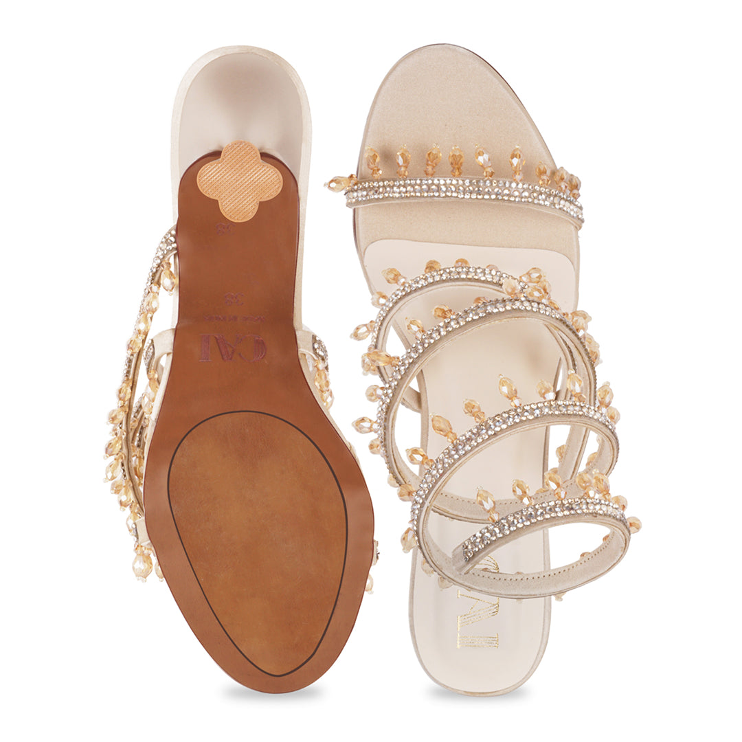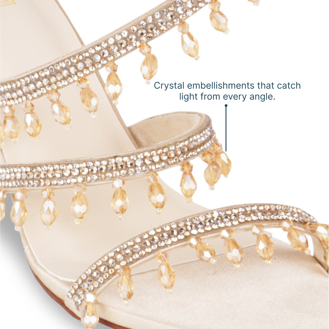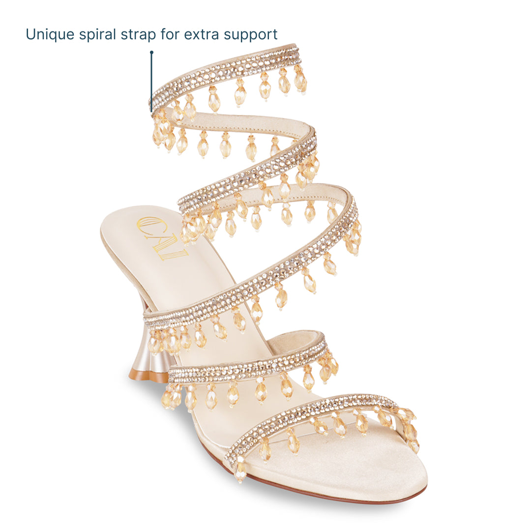 USP: Unique spiral strap for extra support, Crystal embellishments that catch light from every angle with a 3-inch flower heel offers balanced lift with all-day comfort.