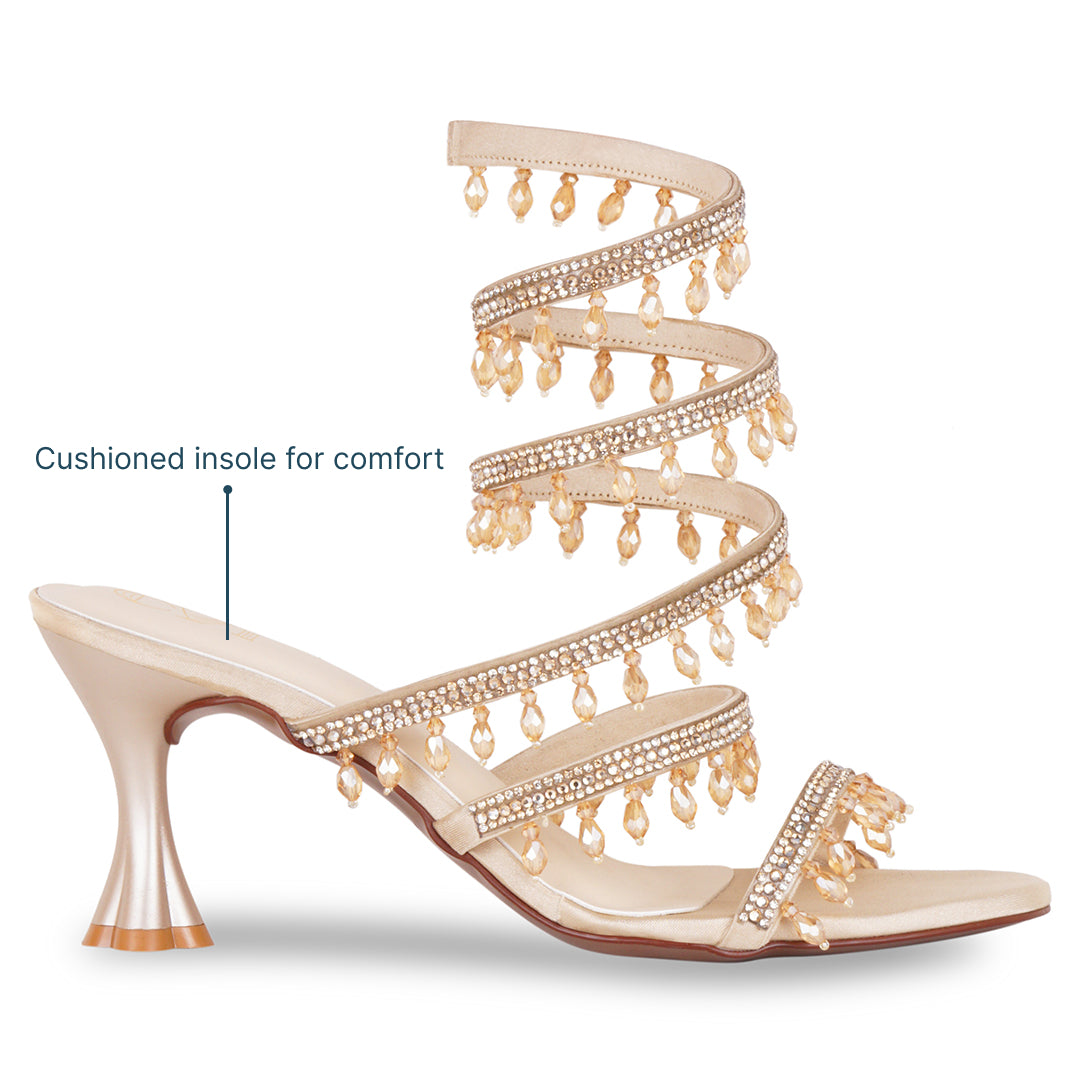 Meet the heels that literally outshine everyone in the room — the Champagne Crystal Heels. Bold, dazzling, and ready to turn heads, it features a sleek spiral strap that wraps elegantly around the ankle, glinting with crystals that sparkle with every move. Every curve, every shimmer, is designed to make each step feel unapologetically like a statement.