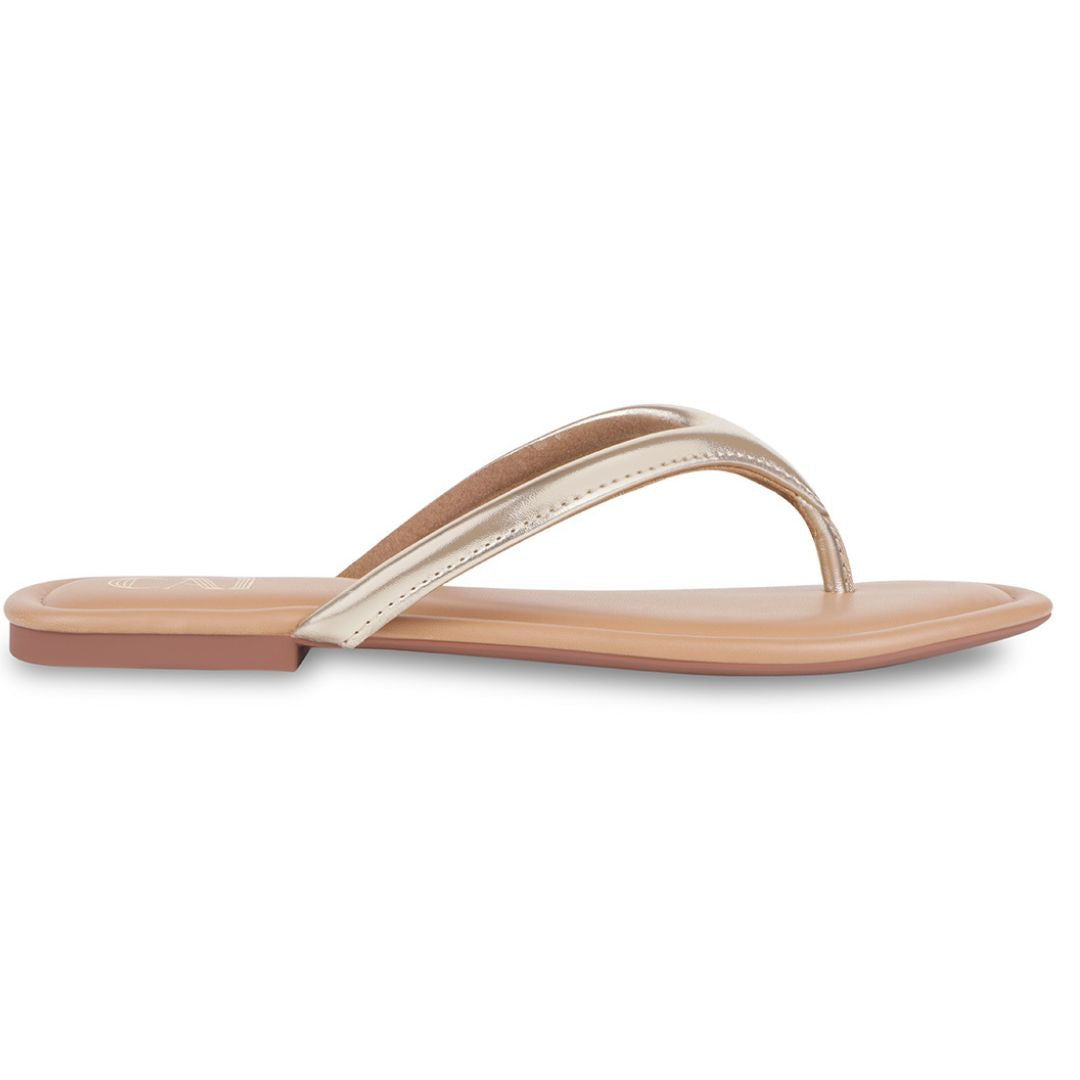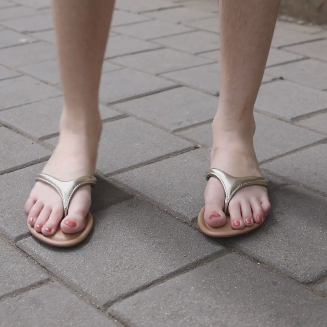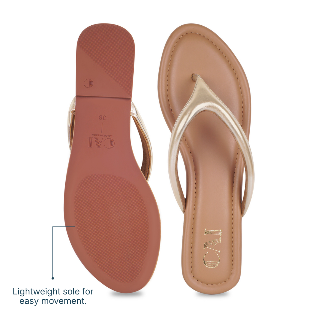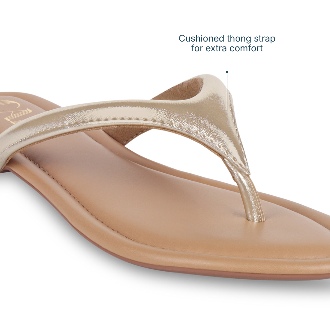 Sleek, refined, and designed for everyday ease, these Crest Gold Flats feature a softly cushioned thong strap that offers gentle support with a barely-there feel. Finished with a smooth, flexible sole that moves naturally with you, they’re made to keep you comfortable through long days while maintaining a clean, understated look—perfect for effortless daily dressing.