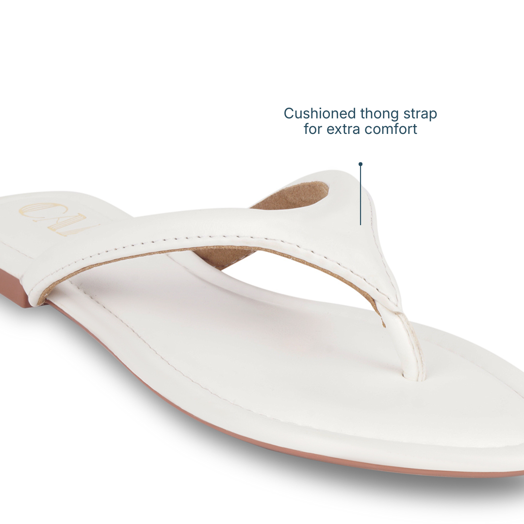 Sleek, refined, and designed for everyday ease, these Crest White Flats feature a softly cushioned thong strap that offers gentle support with a barely-there feel. Finished with a smooth, flexible sole that moves naturally with you, they’re made to keep you comfortable through long days while maintaining a clean, understated look—perfect for effortless daily dressing.