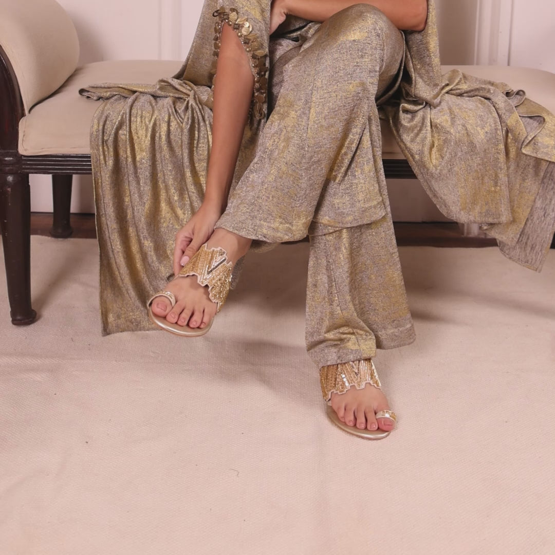 2. Daytime Charm: Match with palazzo pants and an embroidered blouse for brunches or daytime festivities. The toe strap shimmer keeps it festive yet versatile.