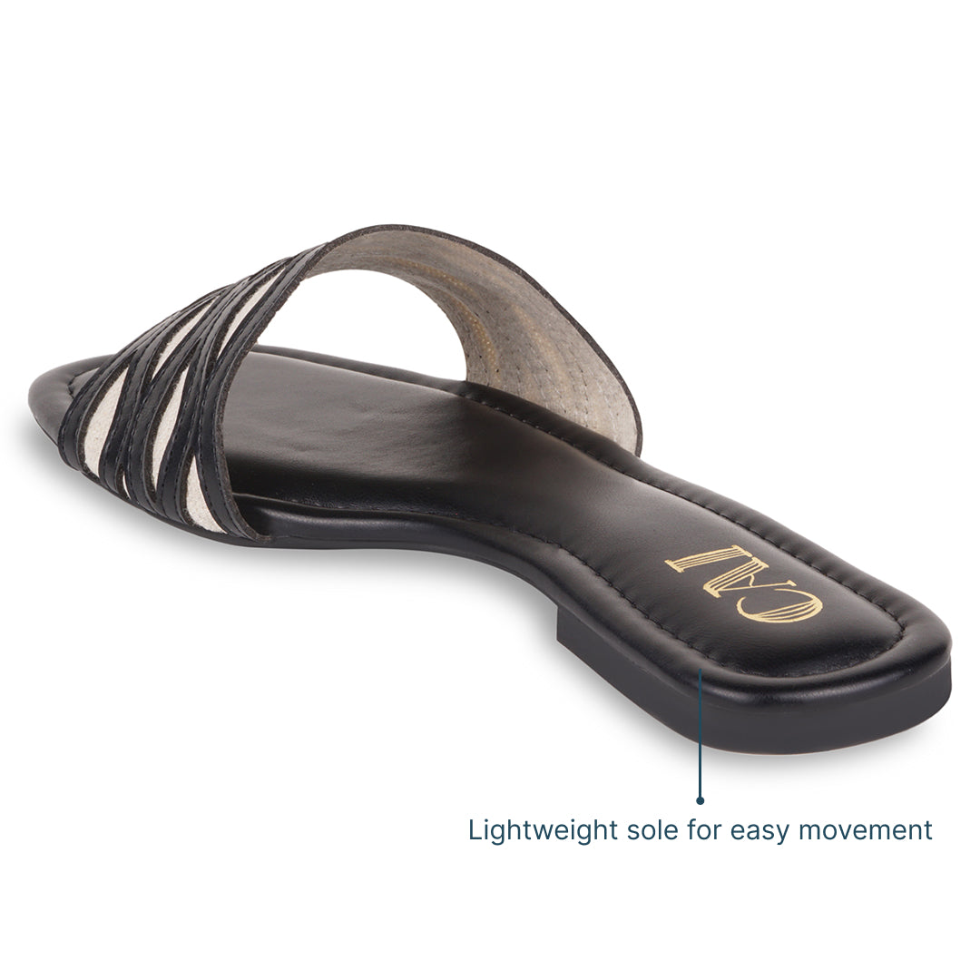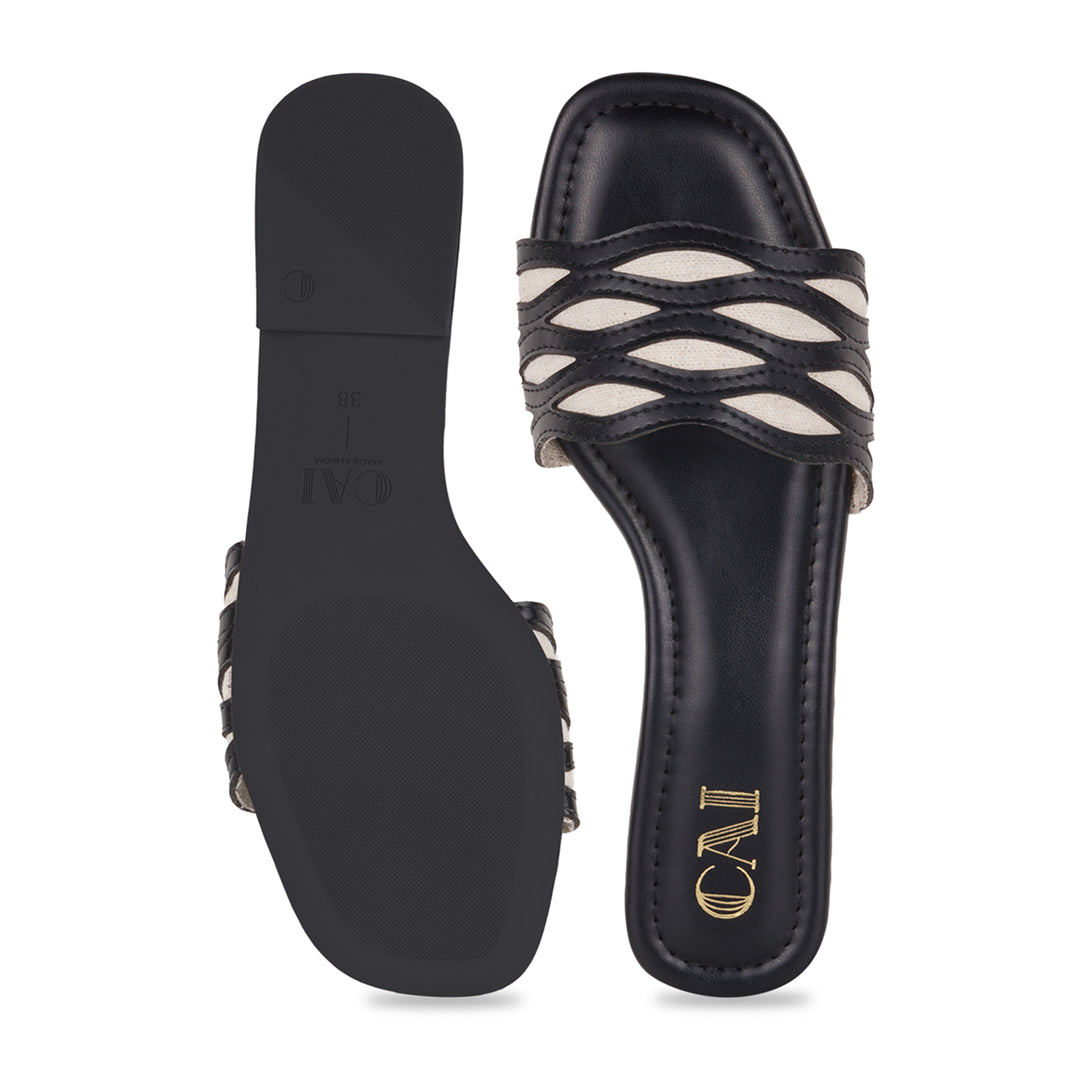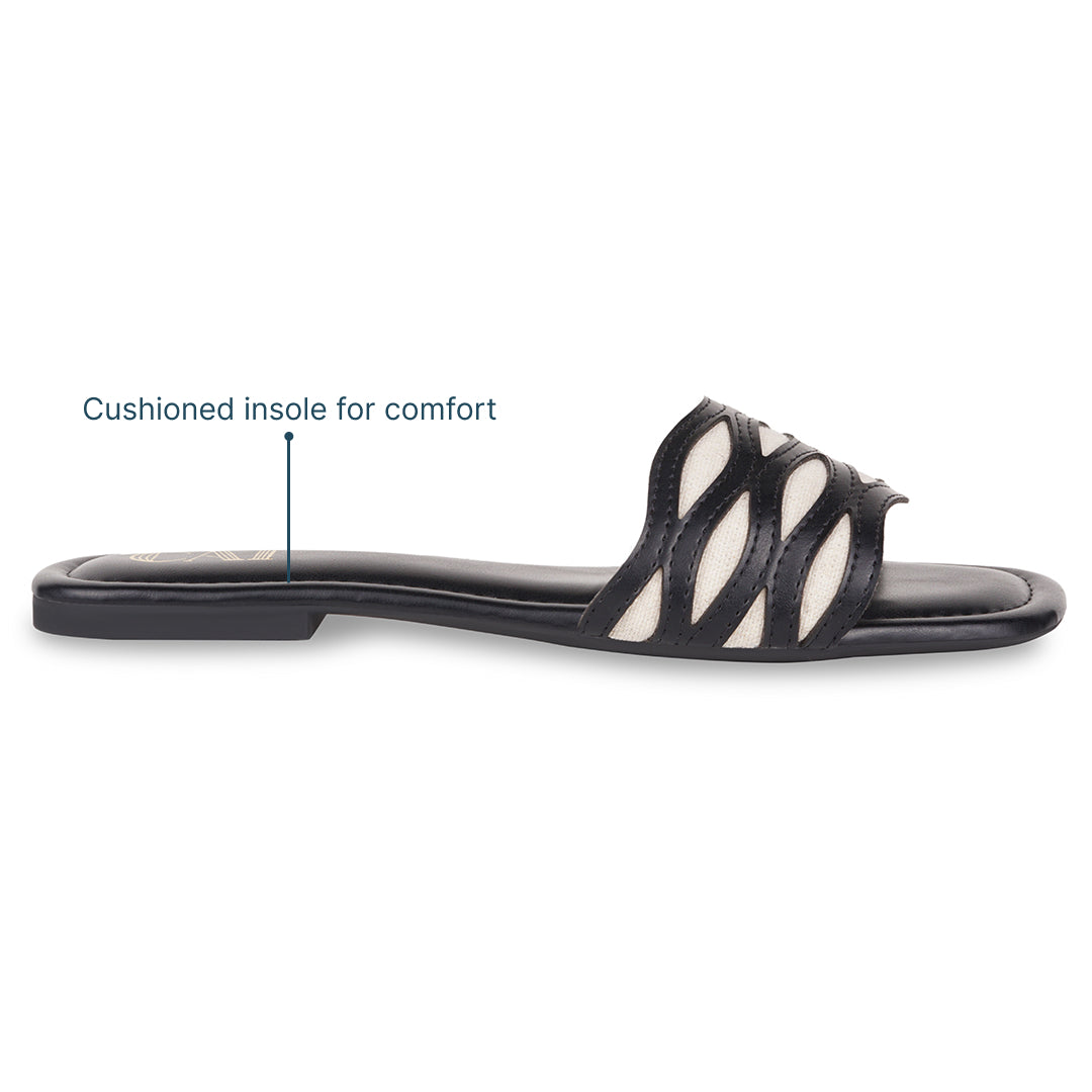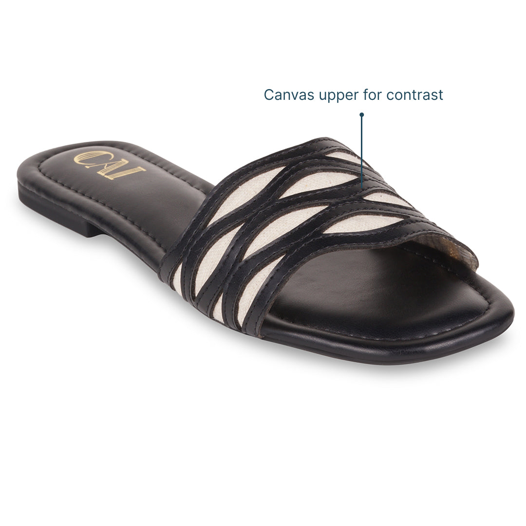 Sleek, versatile, and effortlessly chic, these FlowLine Black Flats are designed for everyday ease. Featuring wavy cut-out straps with canvas contrast detailing, the design adds visual interest while keeping the look light and breathable. A cushioned footbed and smooth finish ensure comfort through long days, making this pair a perfect balance of function and understated style for your everyday errands.